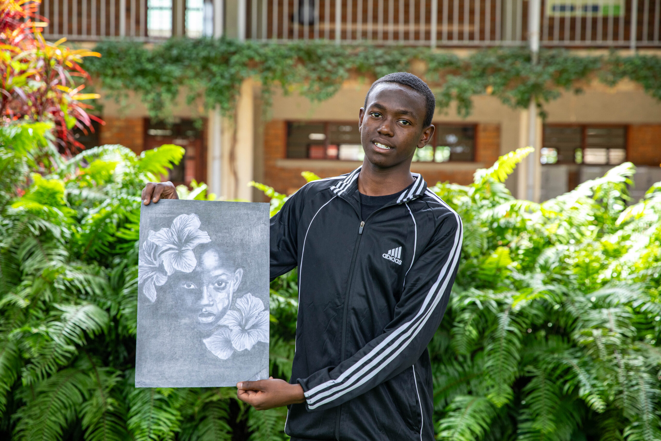 A striking portrsit of a person with captivating facial features. Surrounded by large hibiscus flowers that create a vibrant contrast.